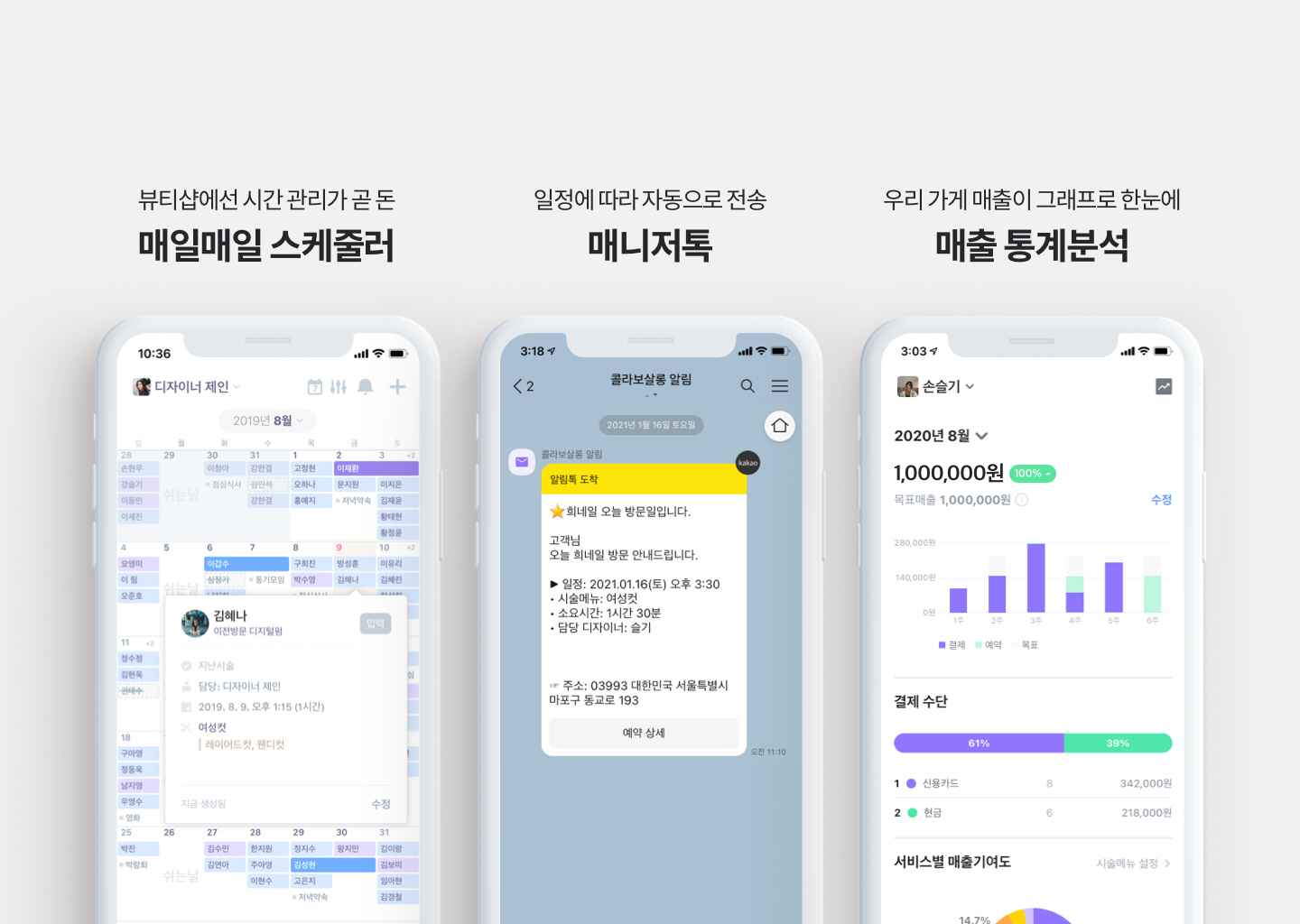 최근 뷰티숍 시장은 고용 임금 상승과 SNS를 통한 직접 영업이 많아지면서 소규모의 개인형 창업이 주를 이루고 있다. 그러나 기존 뷰티숍 솔루션은 중형 이상 규모의 매장 운영을 위해 개발된 PC 기반 시스템으로 매장에서 필요한 일정 및 회계 관리와 고객 기록 업무를 지원한다. 개인샵, 샵인샵, 공유 살롱 등 협소한 공간에서 SNS와 메신저를 활용해 고객들과 소통하는 젊은 창업자들에게 최적화된 모바일 솔루션이 부재한 상황이다.