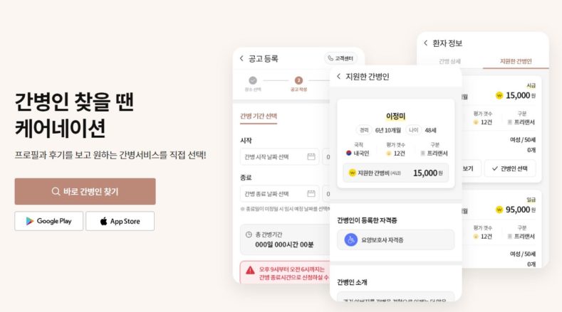 케어네이션은 간병 업계의 대표적인 플랫폼으로, 전국의 환자, 보호자가 원하는 간병인을 직접 선택할 수 있는 개인 맞춤형 매칭 서비스를 제공하고 있다. 국내 최초로 매칭, 결제, 정산까지 전 과정을 자동화하고 출시부터 전국 서비스를 제공하여 보호자와 간병인을 보다 쉽고 효율적인 방식으로 연결한다.
