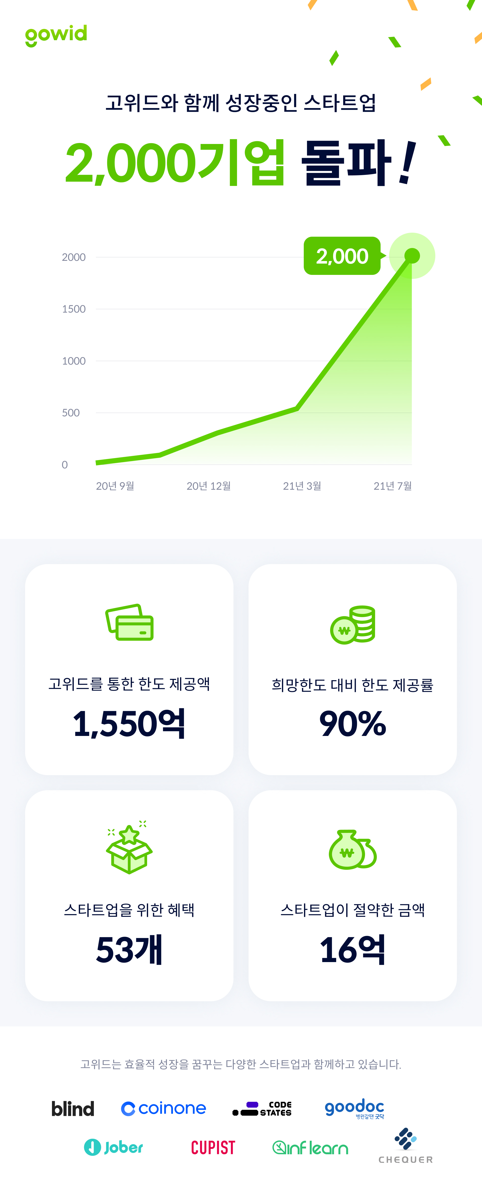 스타트업을 위한 금융 서비스를 제공하는 핀테크 기업 고위드(www.gowid.com, 대표 김항기)가 스타트업을 위한 ‘고위드카드’ 론칭 1년 만에 2,000개 고객사를 확보하며 스타트업 성장을 빠르게 견인하고 있다고 12일 밝혔다.