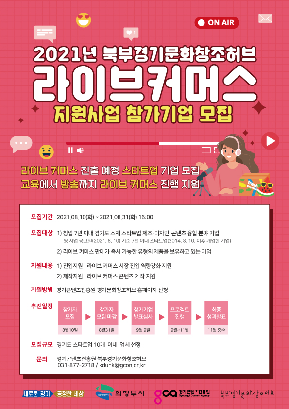경기도와 의정부시, 경기콘텐츠진흥원(원장 민세희, 이하 경콘진)이 운영하는 ‘북부 경기문화창조허브’가 ‘2021년 라이브 커머스(실시간 소통판매) 지원’ 참가 기업을 오는 31일까지 모집한다.