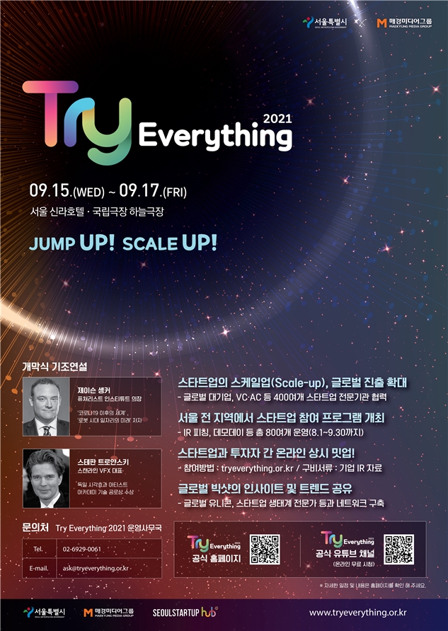 서울시는 글로벌 스타트업 축제 ‘트라이 에브리싱(Try Everything)’에 참여할 예비창업자 및 스타트업을 모집한다.