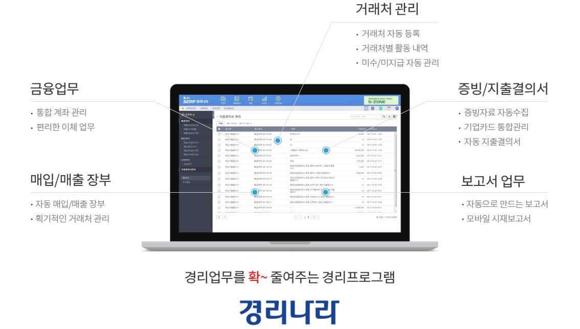 경리나라는 ▲증빙·영수증 관리 ▲통합 계좌 관리 ▲급여·명세서 관리 ▲거래처 관리 ▲결제·송금 ▲모바일 경리나라 ▲지출 결의서 관리 ▲시재·영업 보고서 등 중소기업 및 소상공인의 경리 업무에 필요한 핵심 기능만을 담아 직관적인 사용자 인터페이스(UI)로 제공한다.