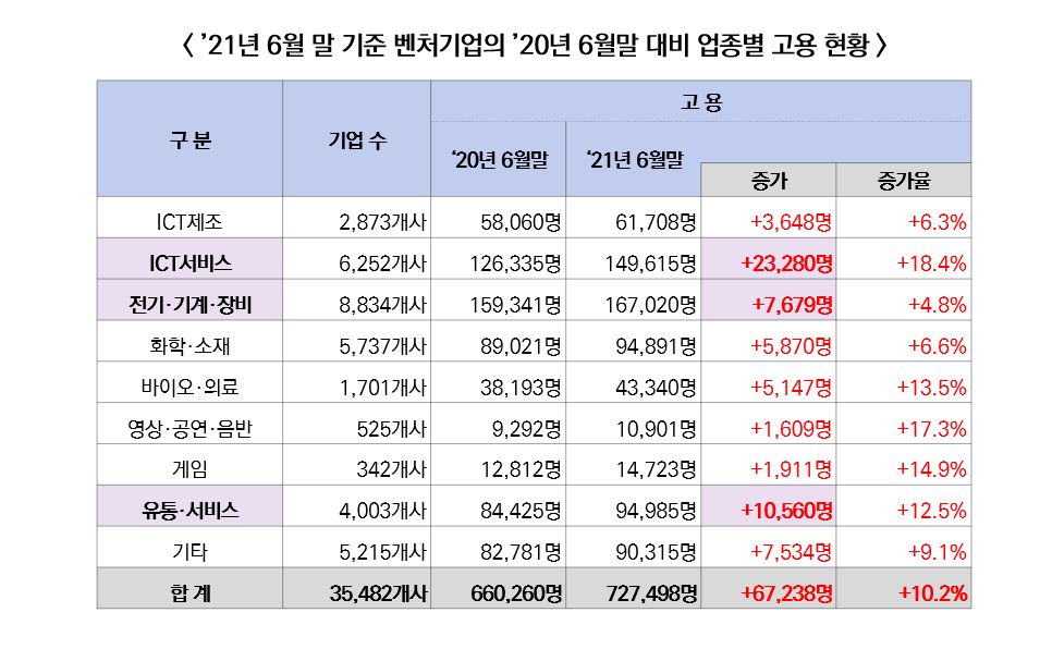 중소벤처기업부(장관 권칠승, 이하 중기부)가 한국고용정보원의 고용보험가입 현황을 토대로 ’21년 6월 말 기준 벤처기업과 벤처투자 받은 기업의 고용 동향을 분석한 결과, 1년 전과 비교해 올해 상반기 고용이 크게 늘어났다고 19일 밝혔다.