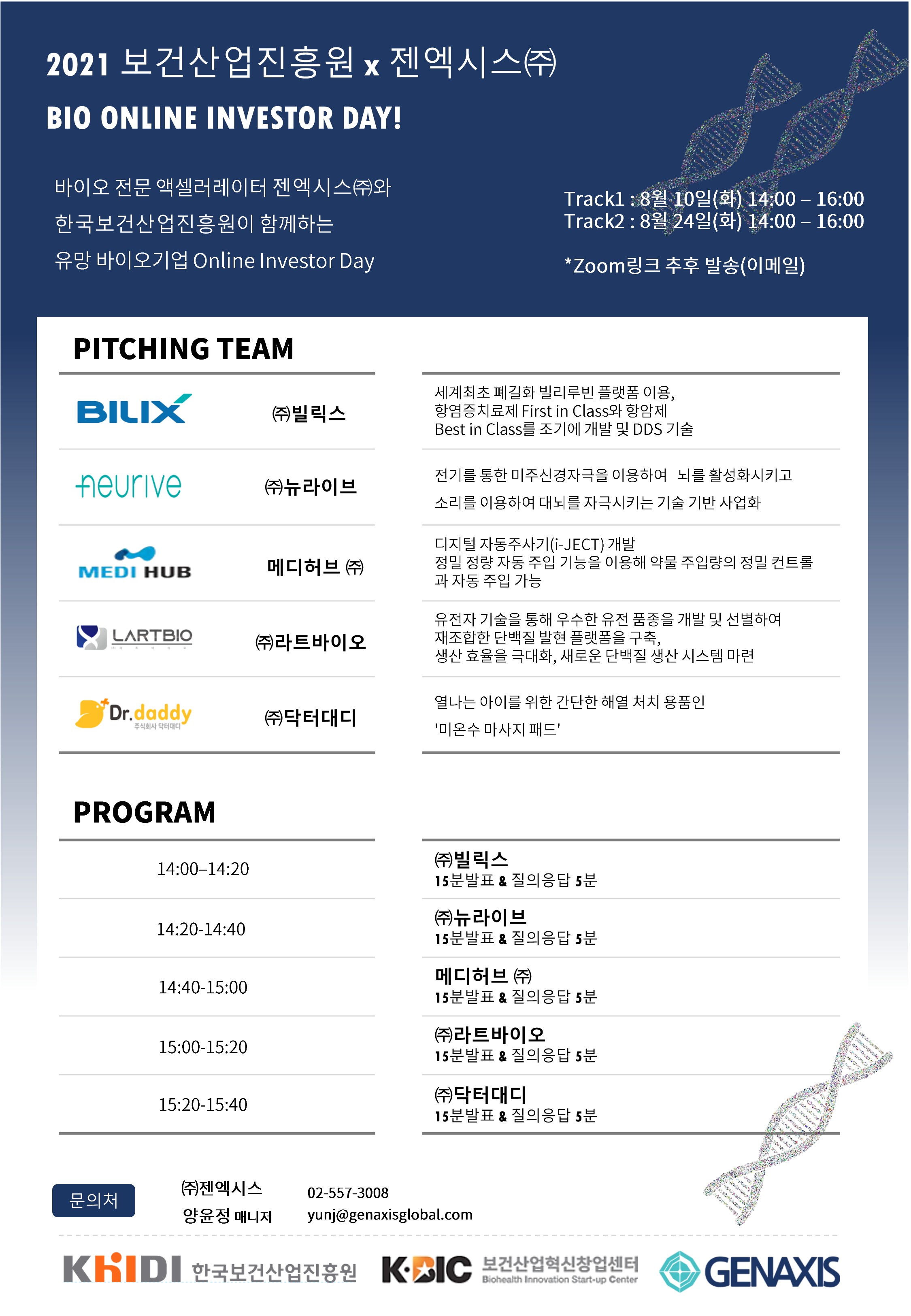 바이오•헬스케어 액셀러레이터 젠엑시스(주)는 보건산업진흥원 바이오기업 5개사의 온라인 인베스터 데이를 오는 24일 개최한다고 밝혔다. 지난 8월 10일 개최된 Online Investor Day Track1에 이은 두 번째 행사다.
