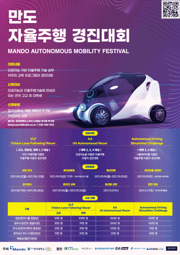 모라이가 협찬기관으로 참여한 ‘2021 만도 자율주행 경진대회’는 주식회사 만도(대표이사 정몽원, 김광헌, 조성현)와 한라대학교(총장 김응권) LINC+사업단에서 주최하는 대회로 ▲카메라를 이용한 자율주행 ▲인공지능을 이용한 자율주행 ▲시뮬레이터를 이용한 자율주행 등 3개 부문으로 진행된다.