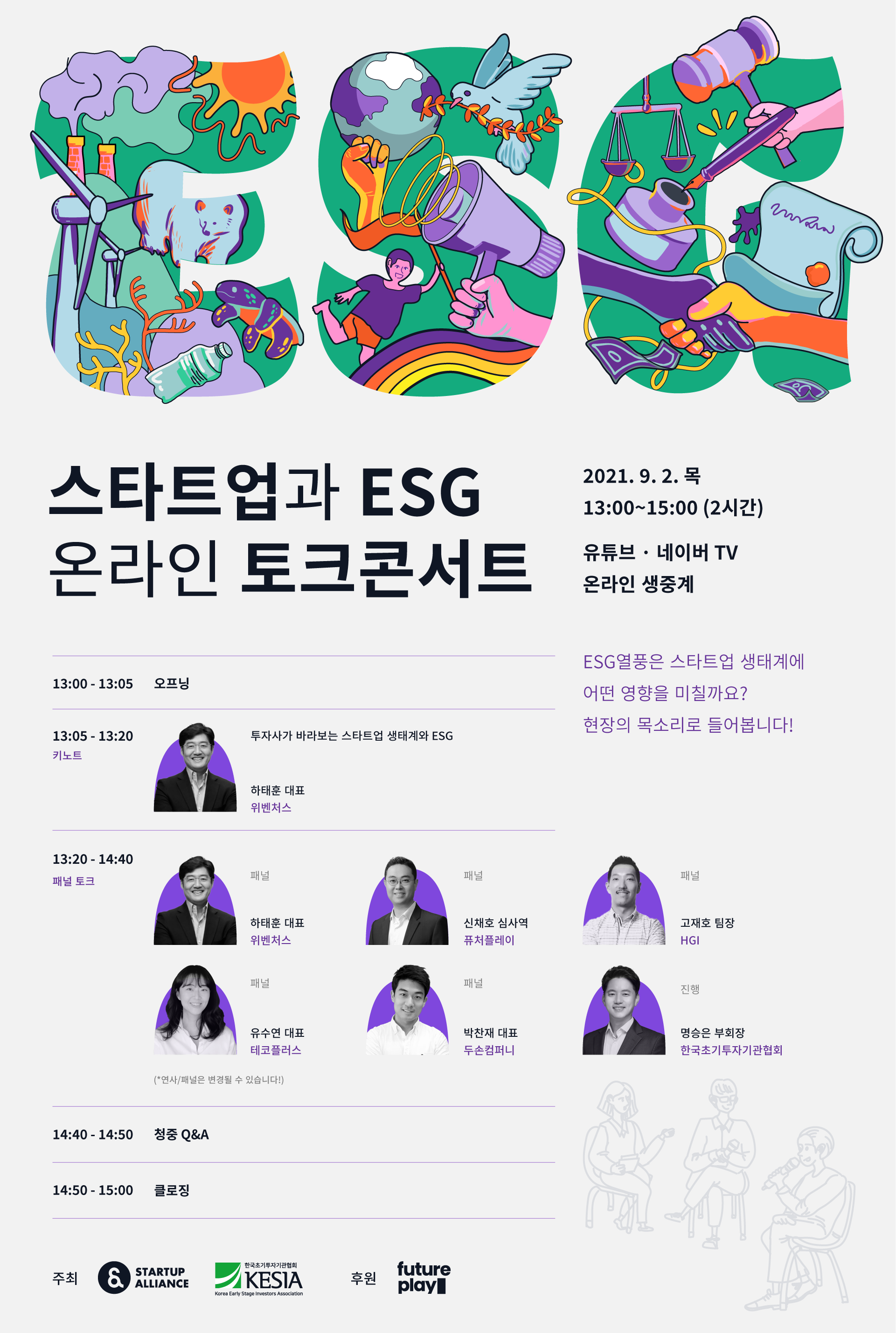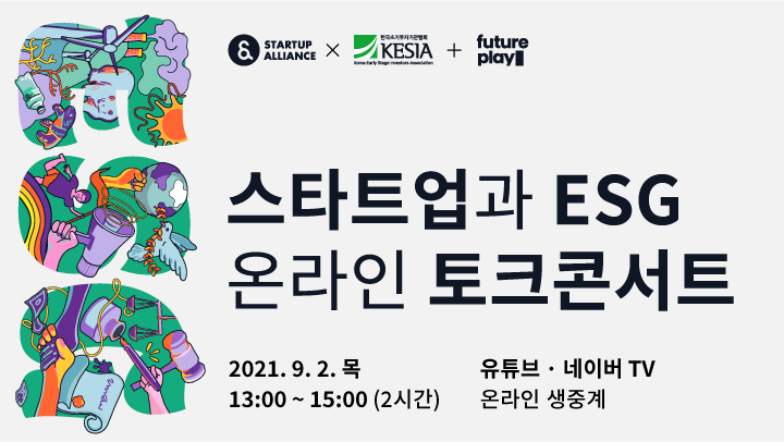 토크콘서트는 오는 9월 2일 목요일 오후 1시부터 3시까지 스타트업얼라이언스 유튜브 채널과 네이버TV채널로 온라인 생중계된다. 이번 토크콘서트는 ESG 열풍이 스타트업 생태계에 미칠 영향을 현장의 목소리를 듣기 위해 마련됐다.