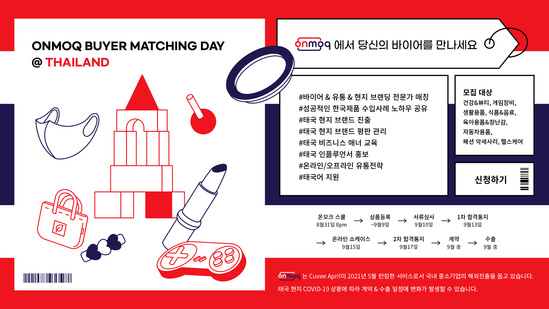 온모크 바이어 매칭데이(ONMOQ BUYER MATCHING DAY)는 현재 홈페이지에서 태국 수출을 원하는 기업의 상품 등록을 진행 중이며, 9월 9일 자정에 지원을 마감한 뒤 10일 서류심사를 거쳐 13일 1차 서류심사에 통과한 기업 명단을 발표한다.