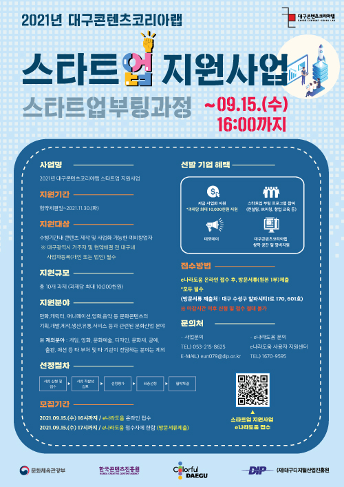 대구광역시가 주최하고 대구디지털산업진흥원(DIP)이 주관하는 대구콘텐츠코리아랩이 ‘2021년 스타트업 지원사업-스타트업 부팅과정’ 참가자를 모집한다.