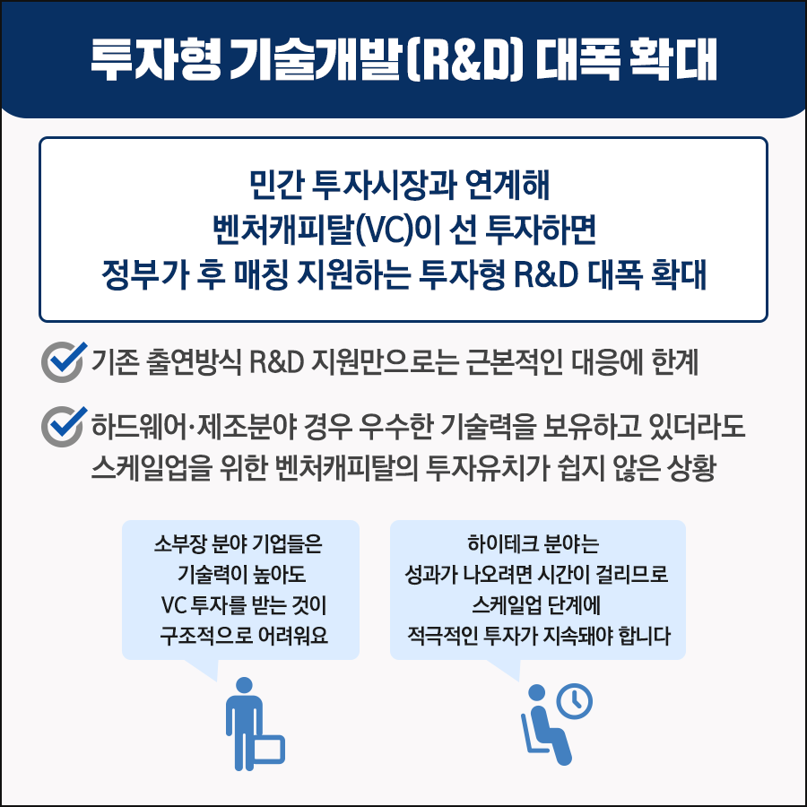 투자시장에서 상대적으로 소외된 제조·하드웨어분야 기술집약형 유망 중소벤처(테크펌) 중심으로 투자형 기술개발의 80%(현행 63%) 이상을 중점 지원한다.