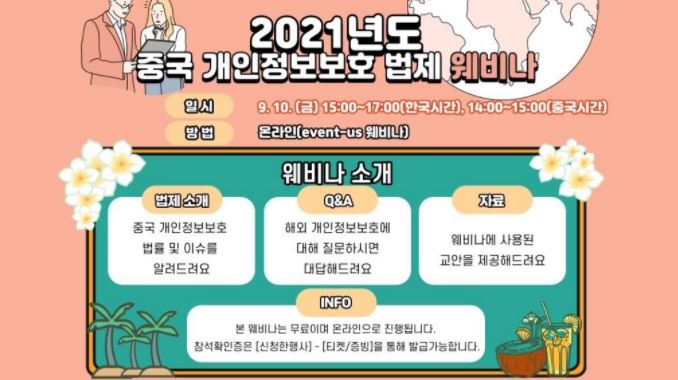 한국 인터넷진흥원에서 주최하는 ‘2021년도 KISA 중국 개인 정보보호 법제 웨비나’가 오는 9월 10일 금요일 15시에 진행된다. 온라인 웨비나로 진행되는 해외 개인 정보 보호 법제와 관련된 궁금증을 해소해 주고자 마련되었다.