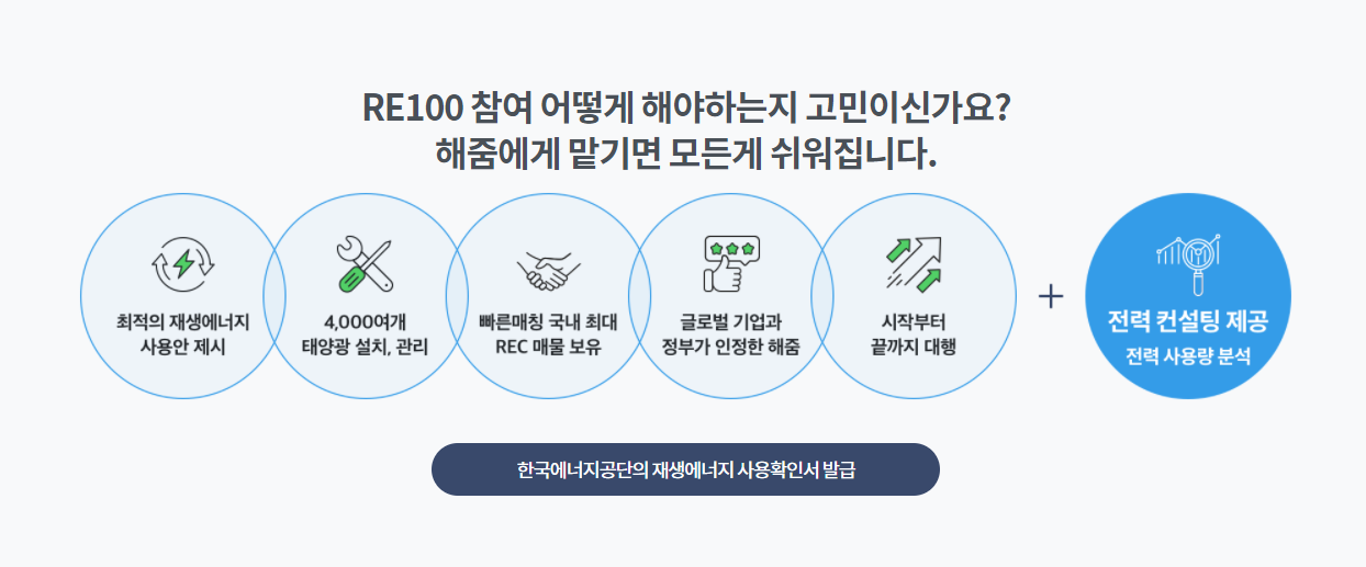 해줌은 정부가 선정한 2021년 RE100 시범사업 참여기업이자 그린뉴딜 유망기업으로 RE100 이행수단별로 노하우와 차별점을 보유하고 있다.