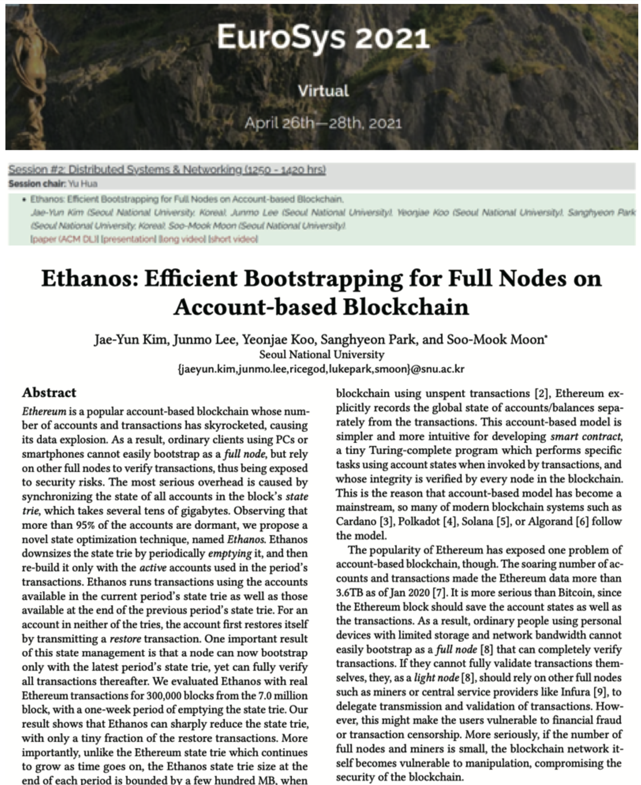 김재윤 대표는 기존 이더리움 구조에서 일반 유저들도 풀노드를 구축할 수 있는 보다 가벼운 블록체인 메인 네트워크 설계를 연구했다. 그는 2021년 4월 컴퓨터 시스템 분야 국제학회인 ‘유로시스(EuroSys21)’에서 효율적인 부트스트래핑을 주제로 논문(‘Ethanos: Efficient Bootstrapping for Full Nodes on Account-based Blockchain’)을 발표했다.
