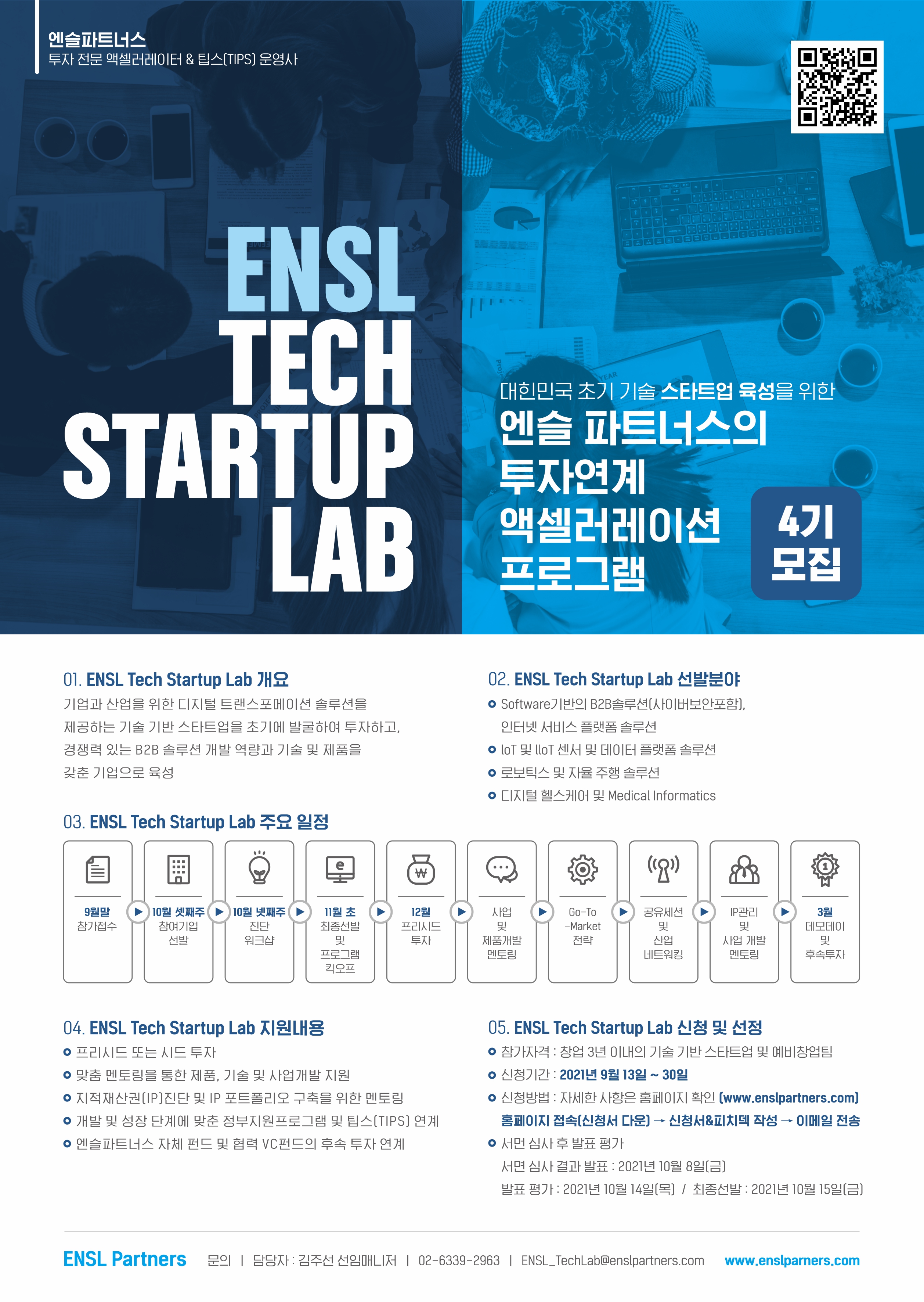 엔슬테크랩4기는 9월 13일부터 30일까지 참가 신청을 받는다. 참가기업 신청은 이메일(ENSL_TechLab@enslpartners.com) 접수를 통해 가능하며 자세한 내용은 홈페이지에서 확인 가능하다.