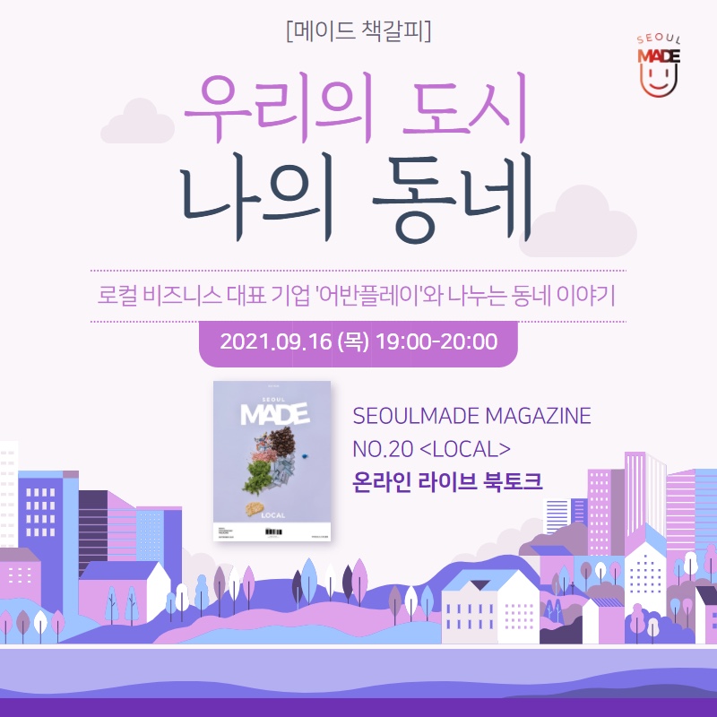 매월 한 가지 주제를 통해 서울의 기업과 브랜드, 창작자를 바라보는 서울메이드 매거진이 북토크를 연다.「SEOUL MADE」20호 ‘LOCAL’을 주제로 보다 풍성한 이야기를 <메이드 책갈피>라는 이름으로 유튜브 라이브로 시민, 기업들과 소통하려 한다.