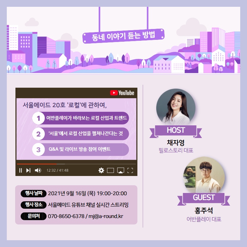 서울산업진흥원(SBA) 서울메이드사업단은 9월 16일(목)에 서울의 산업과 브랜드, 그리고 서울메이드 매거진에 관심있는 기업과 시민을 대상으로 ‘LOCAL : 우리의 도시, 나의 동네’ 북토크를 유튜브 라이브로 진행한다.