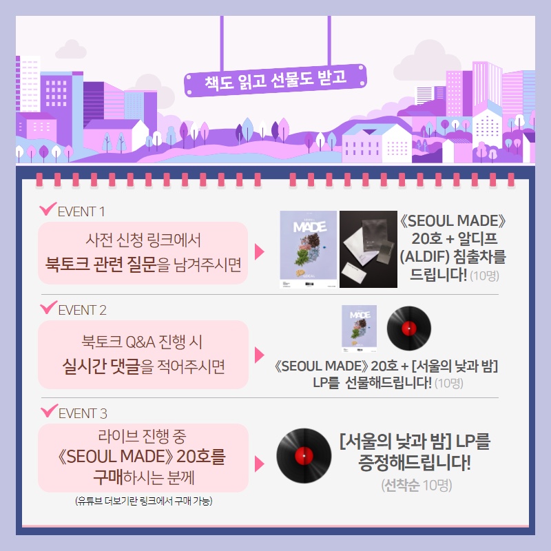 특히, 사전 신청 및 질문, 북토크 Q&A 진행 시 유튜브 실시간 댓글을 통해 다양한 이벤트에 참여가 가능하며 질문 채택 시, 소정의 서울메이드 굿즈 등을 증정한다.