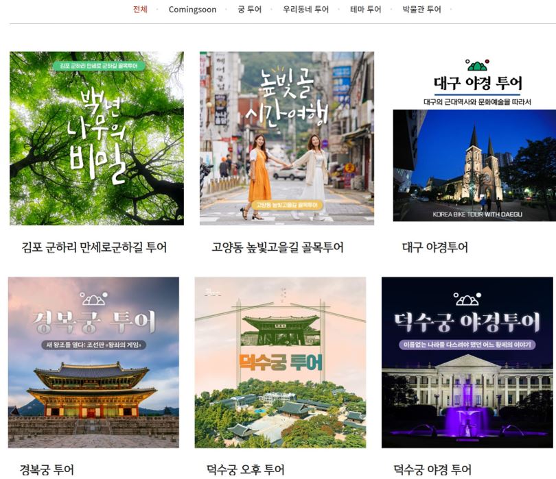 궁 투어부터 시작해서 도심 속 예술 투어와 근교 투어, 지방 곳곳의 명소 투어까지. 단체 여행객부터 소규모 자유여행객, 색다른 워크숍을 추구하는 기업 팀 투어까지.