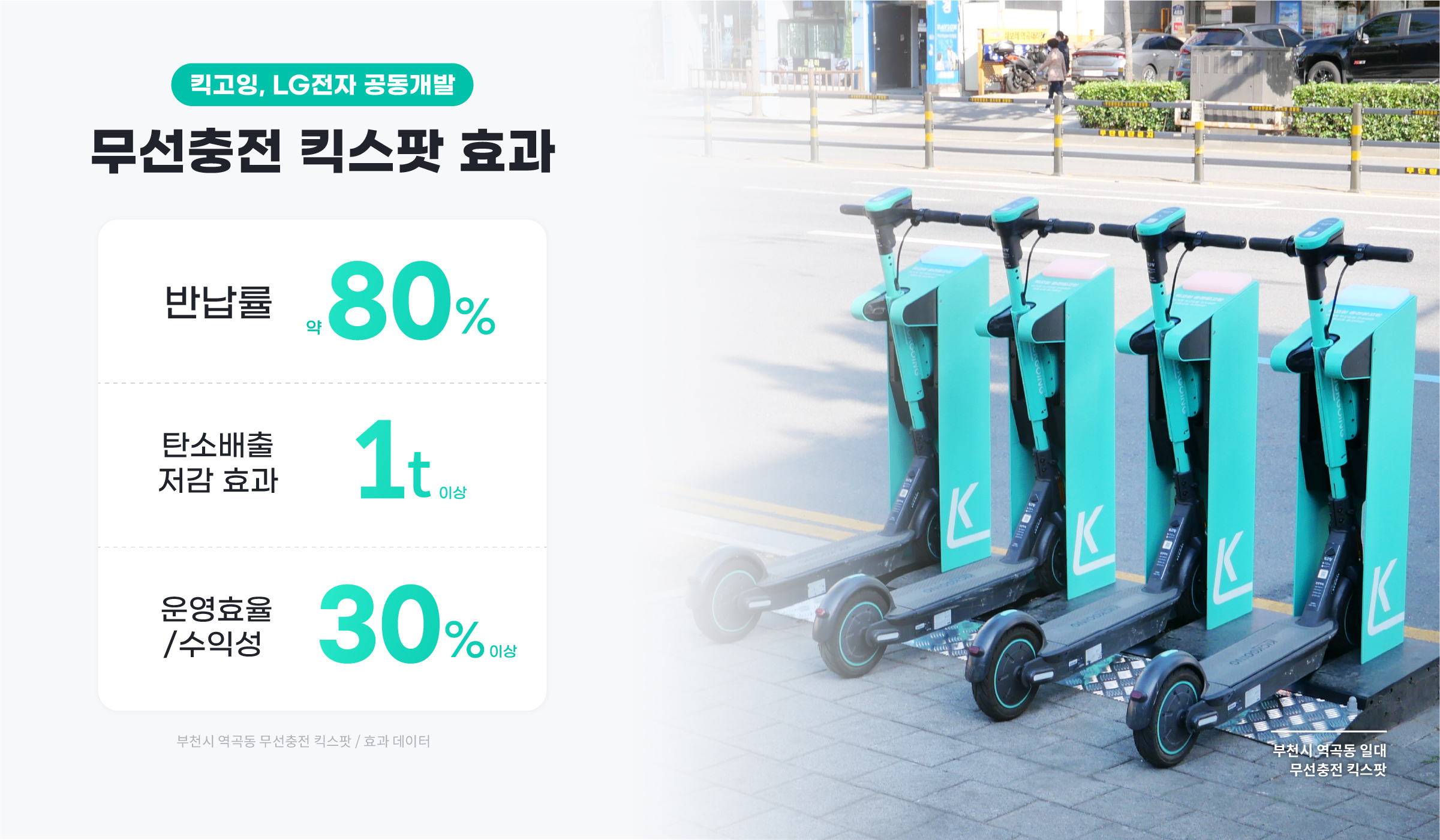 전동킥보드 공유서비스 ‘킥고잉’을 운영하는 ㈜올룰로(대표 최영우)가 부천 스마트시티 챌린지의 일환으로 설치한 무선충전 ‘킥스팟’이 탄소 배출 저감에 성공했다.