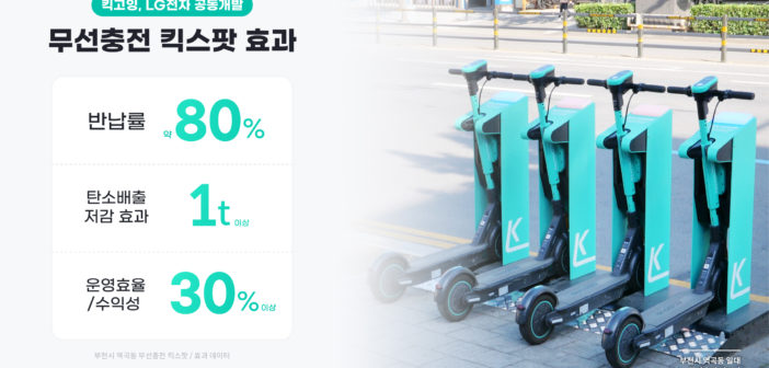 전동킥보드 공유서비스 ‘킥고잉’을 운영하는 ㈜올룰로(대표 최영우)가 부천 스마트시티 챌린지의 일환으로 설치한 무선충전 ‘킥스팟’이 탄소 배출 저감에 성공했다. 무선충전 ‘킥스팟’은 LG전자가 독자 개발한 무선충전기술과 관제기술이 적용되어 거치시 자동으로 충전되는 개인형…