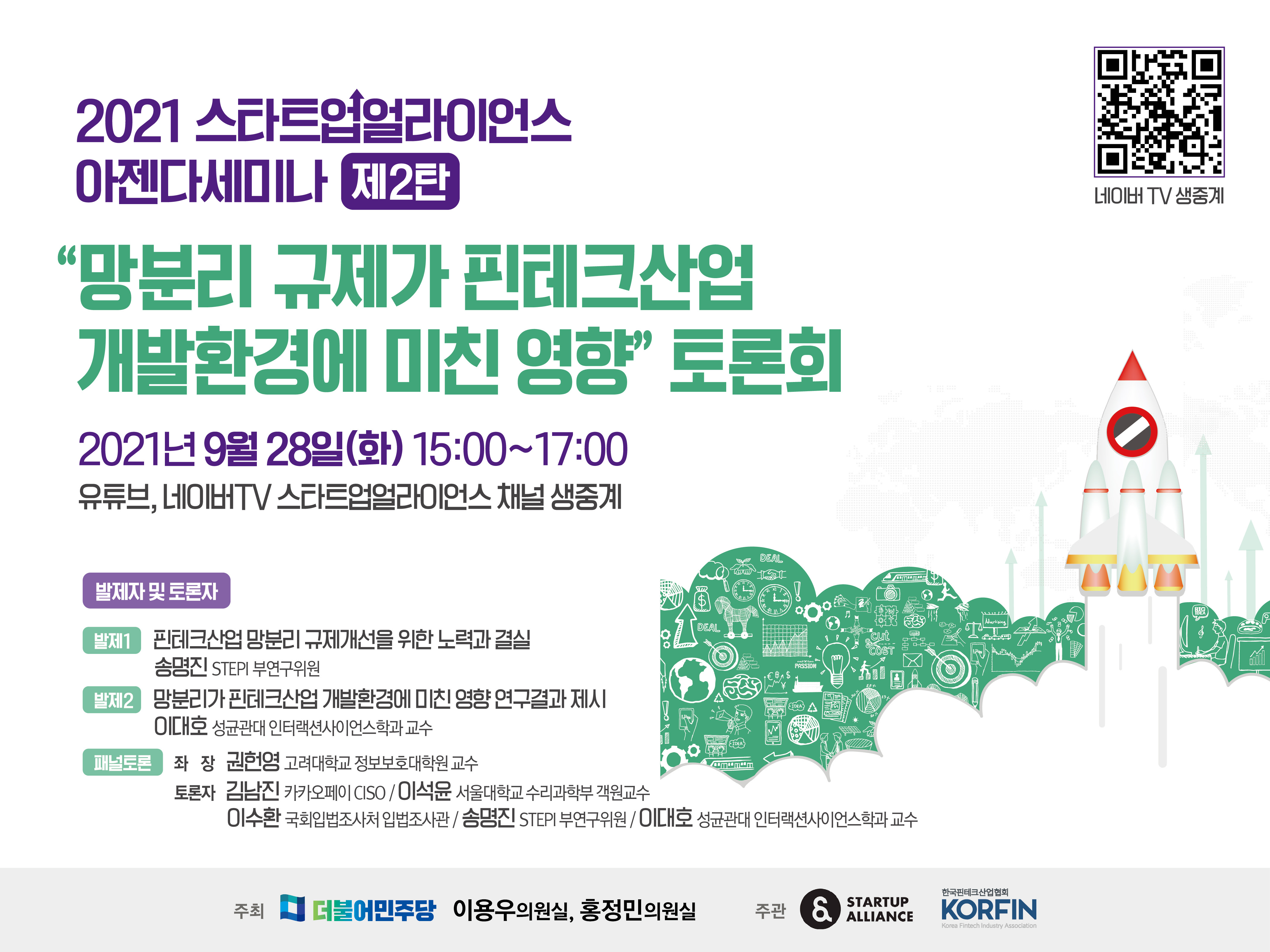 스타트업얼라이언스(센터장 최항집)가 더불어민주당 이용우 의원실, 홍정민 의원실, 한국핀테크산업협회와 함께 망분리 규제가 핀테크산업에 미칠 영향을 알아보는 토론회를 연다.