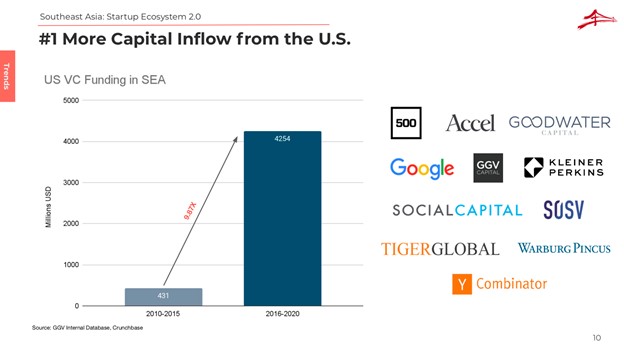 - 미국으로부터의 자본 유입 증가 – Kleiner Perkins, Accel, KKR, Tiger Global 및 Warburg Pincus포함, 지난 몇 년 동안 동남아시아에 투자하는 미국 VC/PE 기업 수 급증.