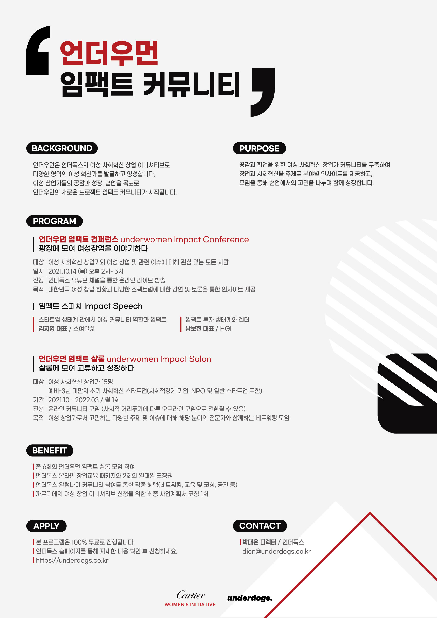 이번 언더우먼 임팩트 커뮤니티는 소셜 임팩트를 추구하는 초기 단계의 여성 창업가를 지원하는 글로벌 프로그램 까르띠에 여성 창업 이니셔티브의 후원을 통해 진행 대상을 기혼 여성에서 2040 전체 여성으로 새롭게 확장하고, 여성 사회혁신 창업가를 위한 콘퍼런스와 커뮤니티 프로그램을 진행한다.