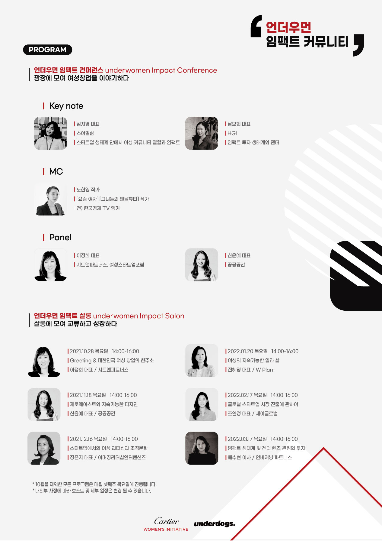 온라인 콘퍼런스에서는 ‘여성 스타트업 커뮤니티(김지영 대표, 스여일삶)’, ‘여성 창업과 임팩트 생태계(남보현 대표, HGI)’ 등을 메인 주제로 연사 특강과 함께 패널토론(이정희 대표; 시드앤파트너스, 신윤예 대표; 공공공간)이 진행된다. 또한 언더우먼 임팩트 커뮤니티 프로그램에 대해 자세한 사항을 확인할 수 있는 안내와 까르띠에 여성 창업 이니셔티브에 대한 소개가 제공된다.