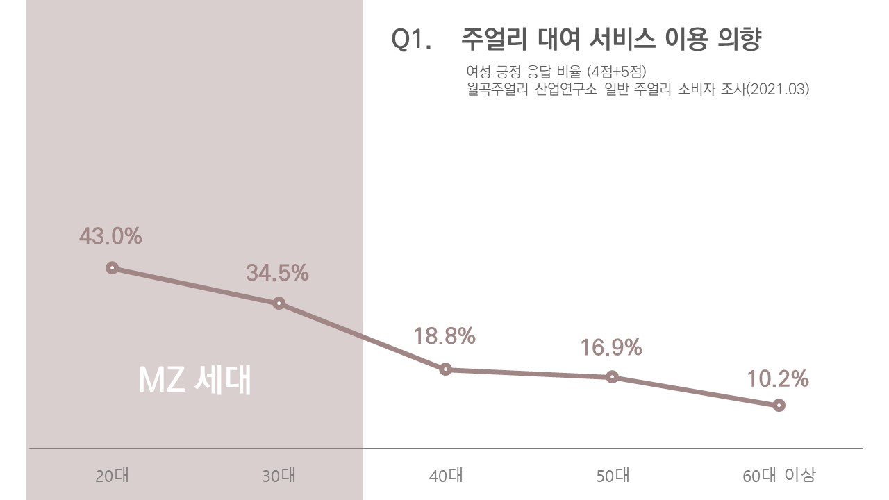 또한 동기관 2021년 3월 일반 주얼리 소비자 조사에 따르면 20, 30대 여성의 43.0%, 34.5%는 주얼리 대여 서비스를 이용할 의향이 있다고 응답하였으며, 포에버링의 ‘바꿈’서비스와 같은 새제품 교환 서비스는 75.6%, 74.2%로 매우 긍정적인 이용 의향을 밝혔다. 특히 2030세대의 금 주얼리 수요 증가와 온라인 구매가 15.9%로(2018년 2~5%대)까지 치솟은 것으로 나타났다.