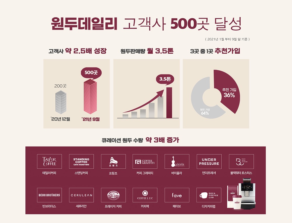 원두 구독 및 커피머신 렌탈 서비스 원두데일리가 고객사 500곳을 확보했다고 밝혔다.