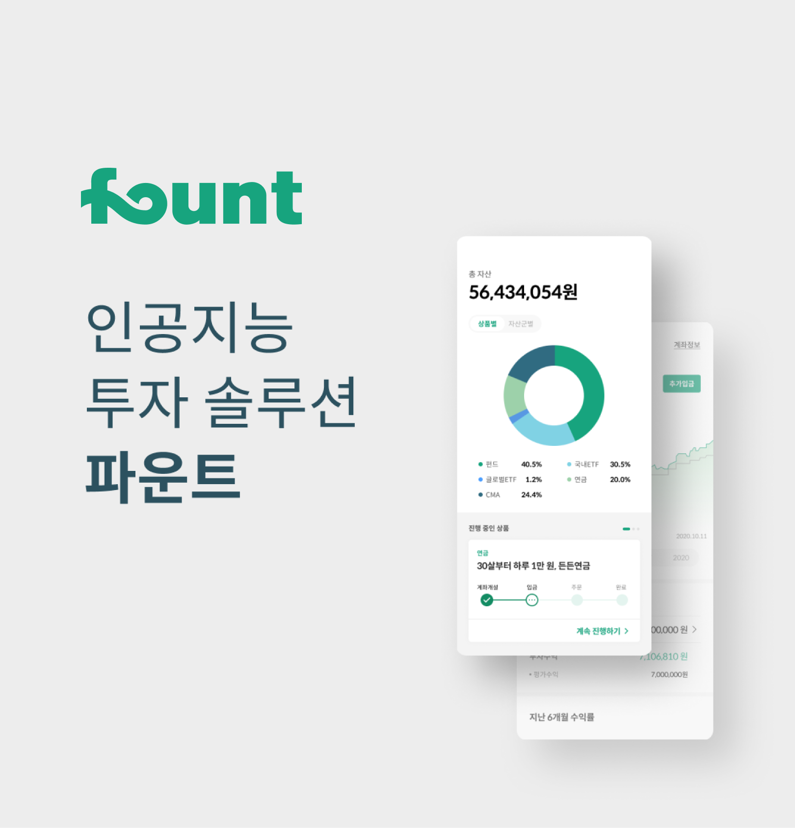 파운트는 자체 개발한 AI 알고리즘이 세계 각국의 경제 및 시장지표를 조합해 5만 2천개가 넘는 시나리오 결과로 산출한 ‘파운트 마켓스코어’를 기반으로 개인의 투자성향에 따라 맞춤형 글로벌 자산배분 포트폴리오를 제공하고 있다. 편리하고 간편한 투자 프로세스, 정기 및 수시 리밸런싱 등의 특화 서비스로 빠르게 성장해왔다.