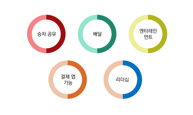 본 슈퍼앱 선별 기준은 총 다섯 가지로 ▲승차 공유 ▲배달 ▲엔터테인먼트 ▲이커머스 ▲결제 앱 기능 ▲리더십을 평가한다. 해당 요소들이 중요한 이유와 3사 평가 내용은 아래와 같다.
