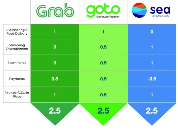 - 그랩: 0점. 몇 년 전만해도 그랩은 아시아 지역 배급사인 후크(Hooq)와 영화 및 시리즈물에 투자를 한 적도 있으나, 이후 후크가 도산하며 현재 엔터테인먼트 부문은 사업을 진행하고 있지 않다.