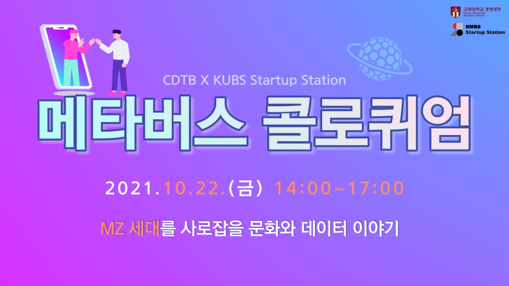 KUBS Startup Station과 고려대학교 경영 대학 스타트업 연구원에서 주최하는 ‘메타버스 콜로퀴엄’이 오는 10월 22일 금요일 14시에 진행된다. 온라인 웨비나로 진행되는 이번 행사는 MZ 세대를 사로잡을 문화와 데이터에 관한 이야기를 나눌 예정이다. 프로그램은 ▲ 연예인 부캐 기반의 메타버스 ▲ 4차 산업혁명과 부동산 메타버스 ▲ 산업에 확장되는 메타버스로 구성된다. ▲ 갤럭시코퍼레이션 최용호 CEO ▲ 하나금융투자 박인규 상무 ▲ 힐스톤 파트너스 조성연 이사가 연사를 맡는다. 4차 산업혁명과 메타버스에 관심있는 누구나 참여할 수 있다. 웨비나에 대한 자세한 내용 확인과 참가 신청은 이곳에서 할 수 있다.