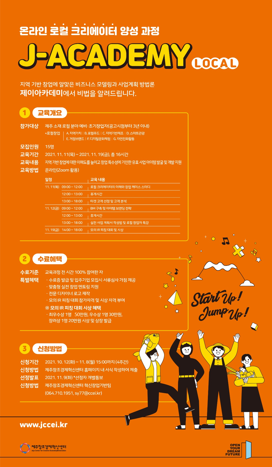 제주창조경제혁신센터(센터장 전정환, 이하 제주센터)는 제주 소재 로컬 분야 예비·초기 창업자들의 창업 역량 함양을 위한 ‘J-Academy(이하 제이아카데미) 로컬 편 2기’에 참여할 인재를 모집한다.