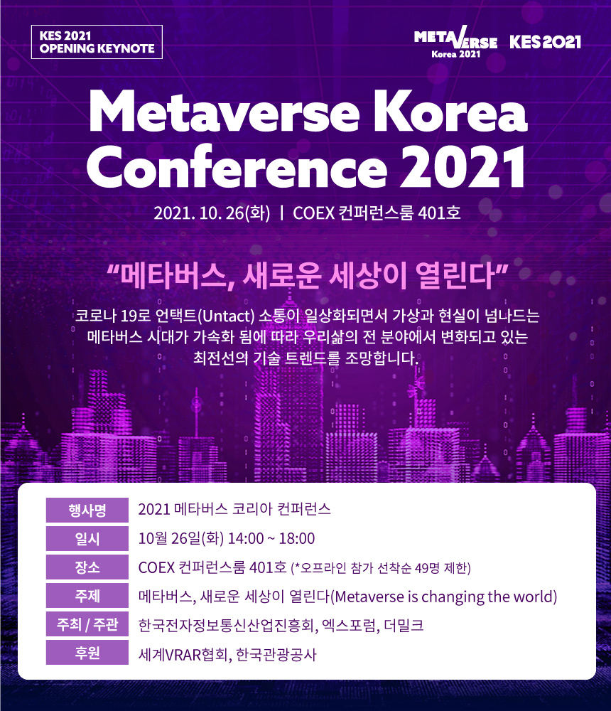 KES 2021(한국전자전) 오프닝 키노트로 진행되는 ‘2021 메타버스 코리아 컨퍼런스’는 “메타버스, 새로운 세상이 열린다(Metaverse is changing the world)”라는 주제로 26일 오후 2시부터 6시까지 코엑스 컨퍼런스룸 401호에서 온․오프라인으로 진행된다.