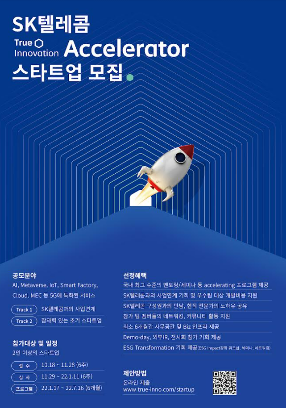 SK텔레콤이 10월 18일부터 다음달 28일까지 ‘True Innovation Accelerator'(트루이노베이션 액셀러레이터) 공모전을 열고 참가 스타트업을 모집한다. 공모분야는 인공지능, 메타버스, IoT, Smart factory, Cloud, MEC 등 5G에 특화된 ICT 분야이다.