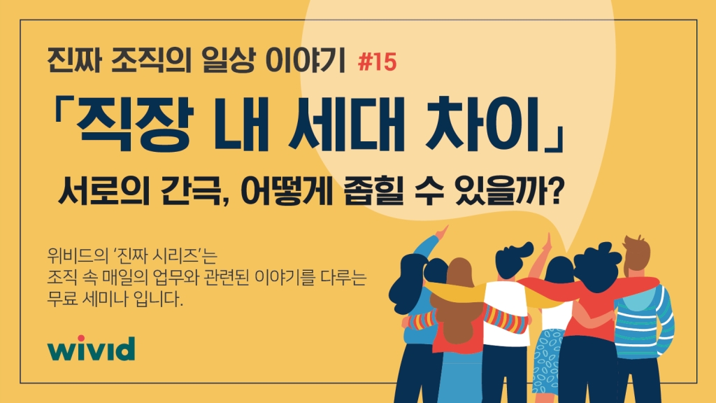위비드가 주최하는 ‘[위비드] 진짜 조직의 일상 이야기 # 15’ 가 오는 10월 27일 수요일 19시 30분에 진행된다. 온라인 웨비나로 진행되는 이번 행사는 직장 내 세대 차이를 주제로 한다. 프로그램의 구성은 다음과 같다. ▲각 세대의 경험 속으로 ▲서로의 입장 들여다보기 ▲다양한 세대가 공존하는 법 ▲Q&A. 다른 세대와의 갈등을 경험한 사람, 요즘 애들과 꼰대를 이해하고 싶은 사람, 조직, 팀을 건강하게 바꾸고 싶은 사람 누구나 참여할 수 있다.