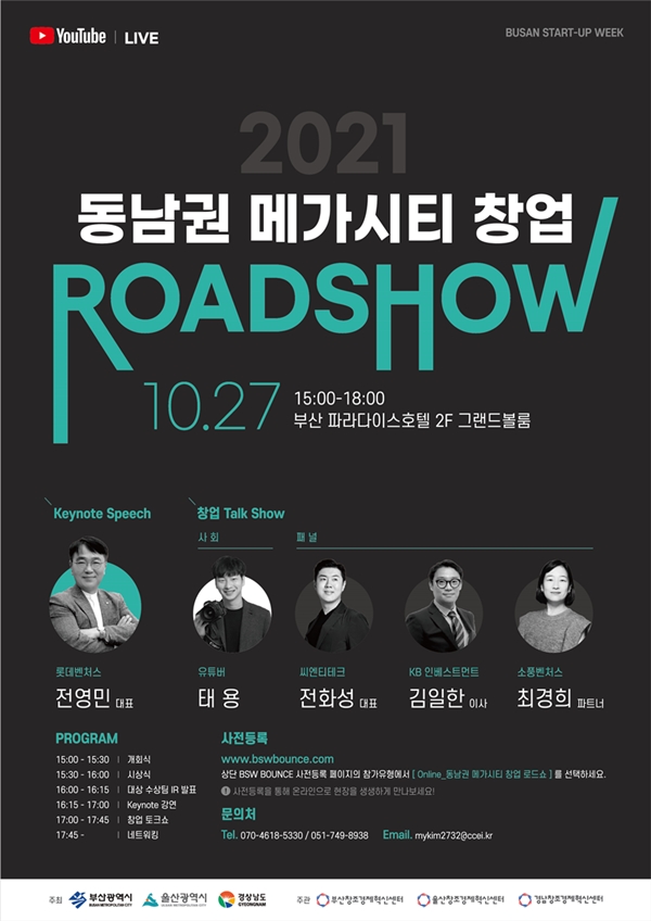 부산광역시(시장 박형준)와 부산창조경제혁신센터(센터장 송용준)는 동남권 경제협력 공동체의 일환으로 지역 상생 발전을 위해 부·울·경 지자체와 부산·울산·경남 창조경제혁신센터가 중심이되어 ‘ 2021 동남권 메가시티 창업 로드쇼’를 개최한다.