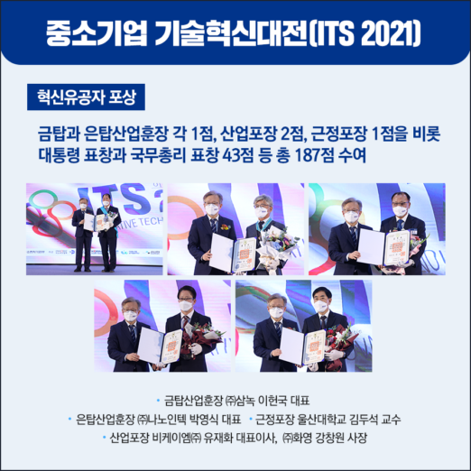 금탑과 은탑산업훈장 각 1점, 산업포장 2점, 근정포장 1점을 비롯해 대통령과 국무총리 표창 43점 등 총 187점을 수여했다. 금탑산업훈장은 ▲㈜삼녹, 이헌국 대표로 조선기자재 도금·도장 부문에서 독자 신기술로 국내시장 점유율 1위 공로를 인정받았다.
