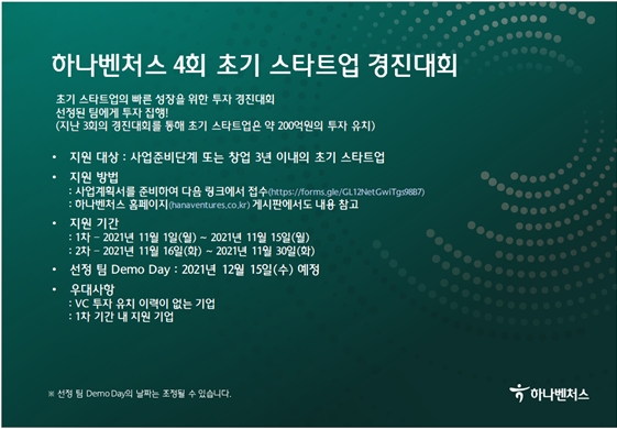 하나벤처스가 4회 초기 스타트업 경진대회를 개최한다.