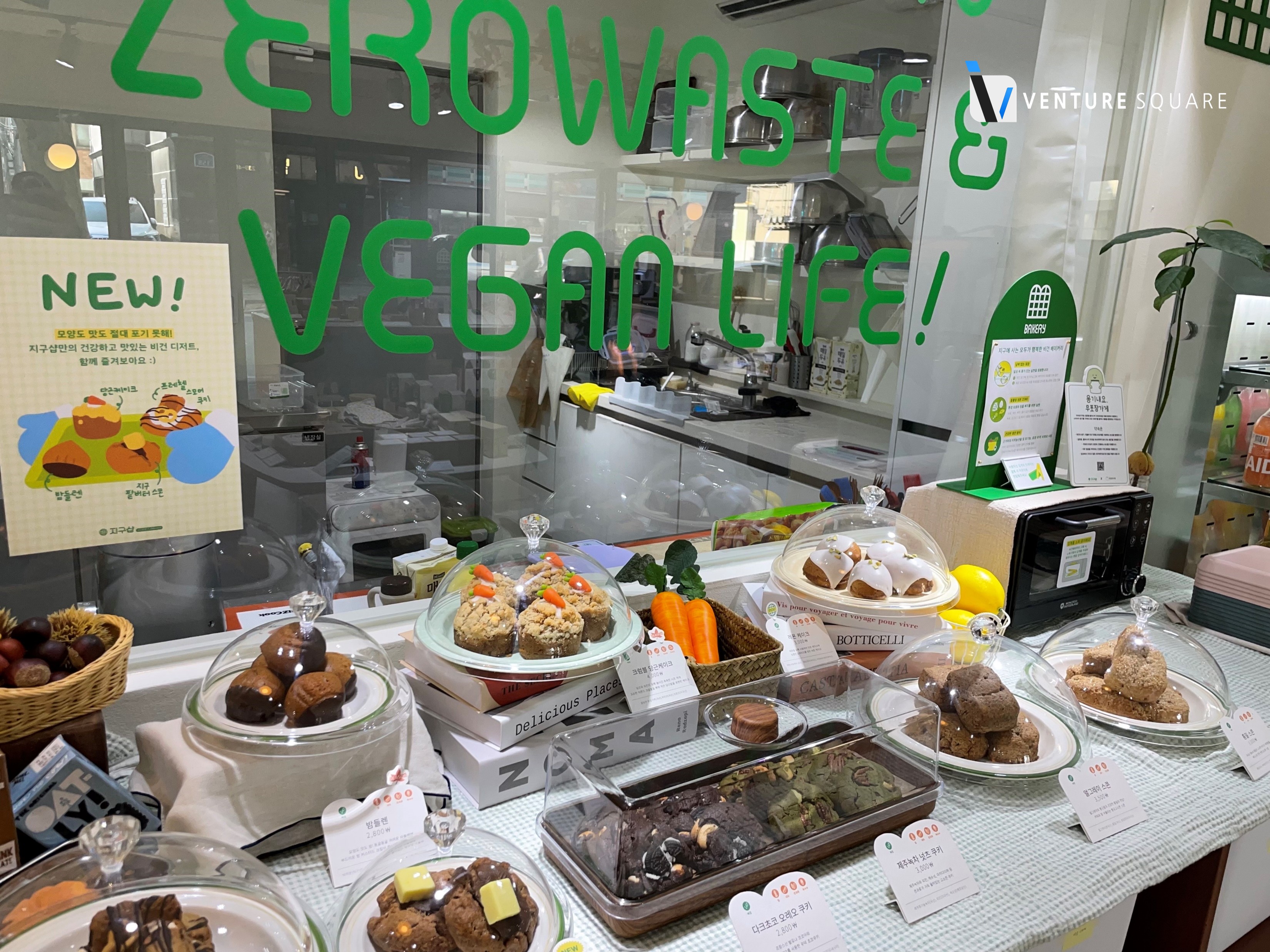 “채식을 실천하는 수많은 이유가 있겠지만, 그 중 하나가 바로 기후변화 문제를 해결하기 위함이지요. 육식을 위해 기르는 식용 가축들이 먹는 곡물과 만들어내는 배설물들이 영향을 미치는 기후 문제가 심각합니다. 환경을 생각하는 제로웨이스트와 비건은 이렇게 떼려야 뗄 수 없기 때문에 다양한 방법으로 환경 문제 해결을 실천하실 수 있도록 비건 베이커리 코너도 마련해두었습니다.”