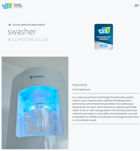 주식회사 공공의 차세대 공기청정기 ‘스워셔’가 오는 2022년 1월 개최되는 세계 최대 가전/IT 전시회 ‘CES 2022’를 앞두고 ‘CES 혁신상’을 수상했다.