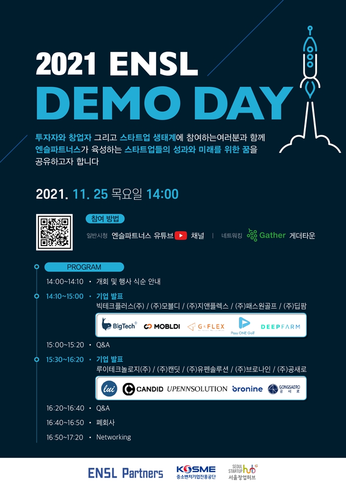 2021년 엔슬 데모데이는 오는 25일 오후 2시부터 ‘엔슬파트너스 유튜브 채널’을 통해 참여 가능하며 ‘게터다운’을 통하여 온라인 네트워킹을 할 수 있다.