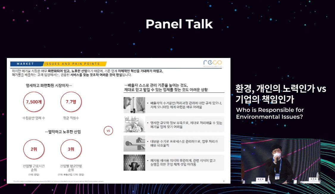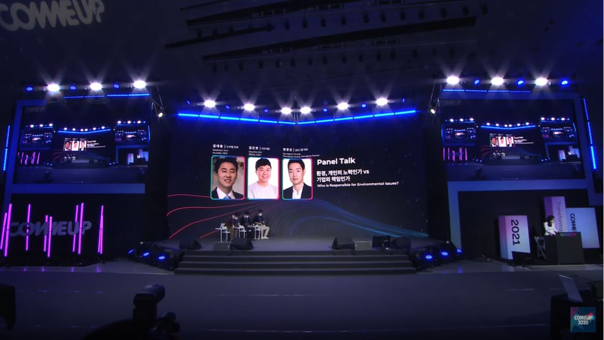 컴업 둘째날인 18일 3시반, 실반그룹 정경선 공동대표와 AI, 빅데이터를 활용한 식품 스타트업인 누비랩 김대훈 대표, 기업형 폐기물 수거 서비스를 제공하고 있는 김근호 리코 대표가 모여 [환경, 개인의 노력인가 vs. 기업의 책임인가]의 주제로 패널 토크를 나누었다.
