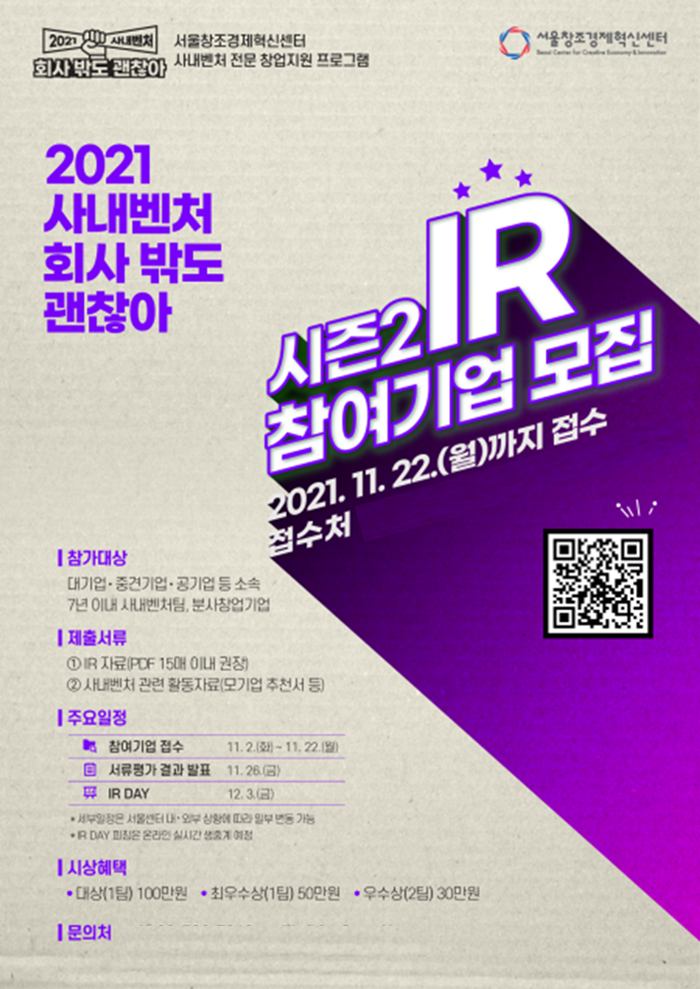 서울창조경제혁신센터(센터장 황윤경)는 ‘2021 사내벤처 지원 프로그램(사내벤처 회사 밖도 괜찮아) 시즌2’ IR에 참여할 사내벤처팀을 오는 22일까지 모집한다.