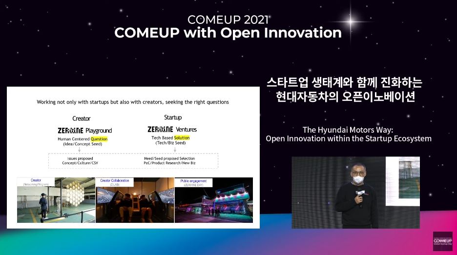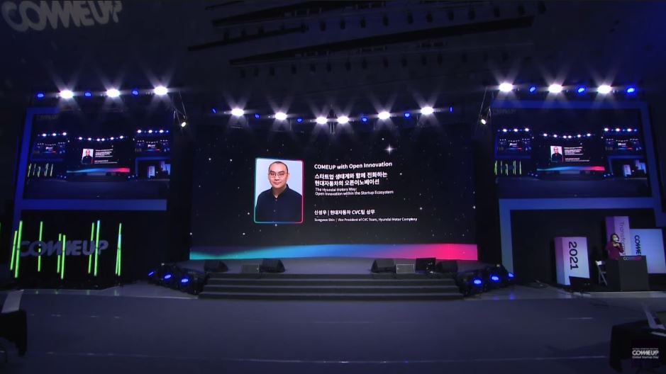 현대자동차 CVC팀 신성우 상무가 17~19일 삼일 간 서울 동대문플라자DDP에서 개최된 ‘컴업 2021’에서 스타트업 생태계와 함께 진화하는 현대자동차의 오픈이노베이션을 주제로 연사를 진행했다.