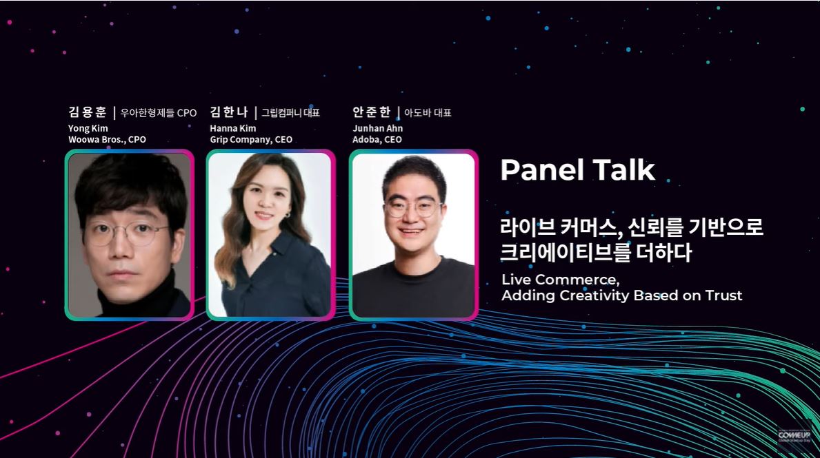 19일 오후, 중국 전문 콘텐츠 서비스 스타트업 아도바의 안준한 대표가 모더레이터로 나서 ‘배달의민족(이하 배민)’으로 우리 가까이 있는 우아한형제들 김용훈 CPO, 그리고 그립컴퍼니의 김한나 대표와 함께 [라이브 커머스, 신뢰를 기반으로 크리에이티브를 더하다]라는 주제로 이야기를 나누었다.