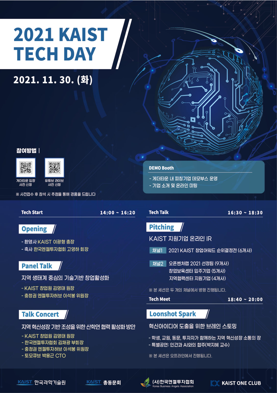 한국과학기술원(KAIST, 총장 이광형)은 한국엔젤투자협회(회장 고영하), KAIST One Club(KOC, 회장 권재중)과 함께 오는 11월 30일 ‘2021 Tech Day’를 진행한다고 밝혔다. 이번 행사는 오후 2시부터 8시까지 여섯 시간 동안 온라인(유튜브·게더타운)채널과 오프라인(KAIST 창업원 W8) 현장에서 동시에 개최될 예정이다.