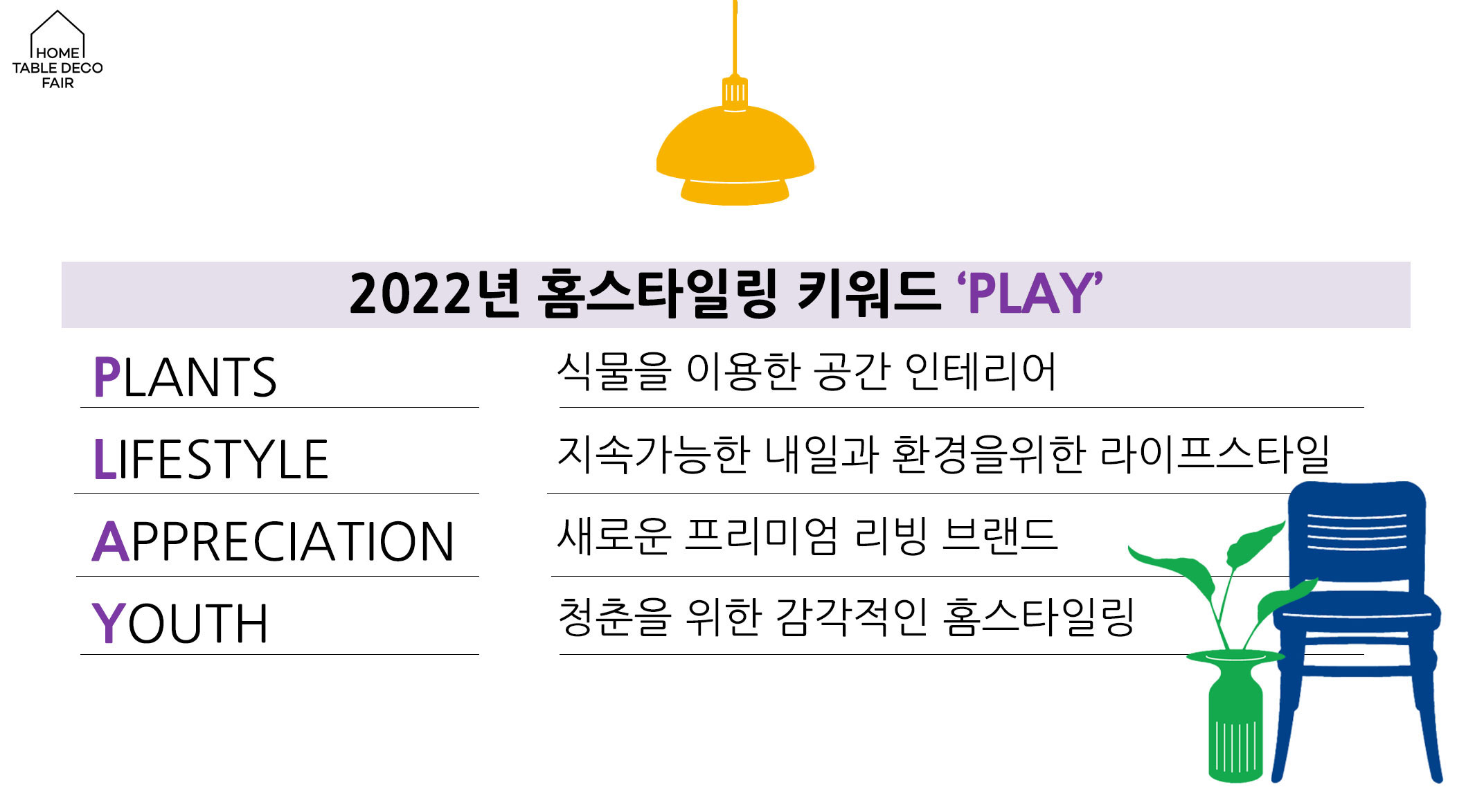 이에 국내 프리미엄 홈스타일링 전문 전시회인 홈·테이블데코페어는 소비자들의 취향과 관심사를 분석한 내용을 바탕으로 ‘플레이(PLAY)’를 2022년 홈 스타일링 키워드로 꼽았다. ‘놀다’라는 뜻을 가진 ‘플레이’는 사람들을 즐겁게 해주는 일이나 활동을 나타낸다. 홈·테이블데코페어는 ‘플레이’를 키워드로 선정해 설레고 즐거운 트렌디한 리빙 스타일을 선보일 예정이다.