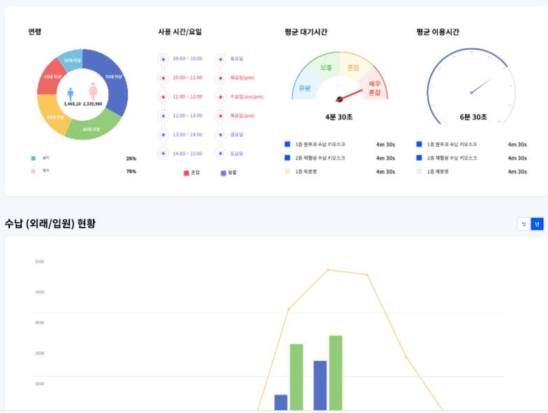 키오스크나 모바일 등 스마트기기를 통해 처리되고 있는 수납 현황, 보험 청구 현황, 예약 현황 등 병원 원무 업무를 위한 다양한 지표들도 실시간으로 확인이 가능하다. 각종 기기에서 발생하는 오류나 장애가 실시간으로 탐지되면 카카오톡으로 병원관계자에게 전송되어 대기 없이 즉각적인 조치가 가능하다. 병원 관리자는 하나로 통합된 대시보드를 통해 스마트병원 기능을 모니터링 및 제어할 수 있다.